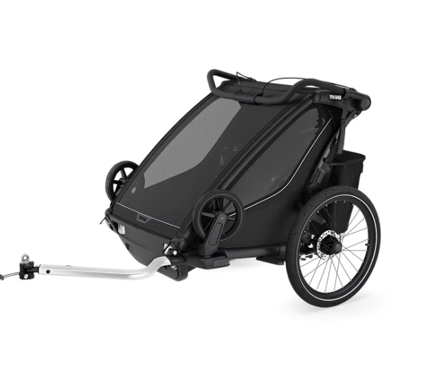 Si on fait du vélo ou du jogging, le chariot Thule est un MUST! En photo vous retrouvez le sport double qui a 2 harnais. Il offre la possibilité de centrer un seul harnais pour créer plus d’espace à un enfant (ou aux sacs) tout en demeurant centré afin de répartir le poids également. C’est le plus complet dans la gamme Thule. Idéal pour vélo, ski de fond (avec accessoires) Jogging (avec roues fixes) ou pour le quotidien.